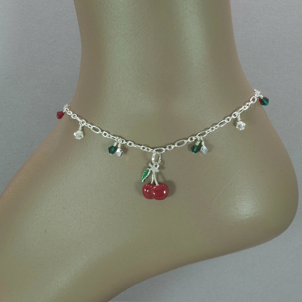 One of a kind anklet with a silver enamel cherry charm with crystal beads on a sterling silver chain. Lobster clasp. Adjustable length measuring 10 3/4″ at the longest.