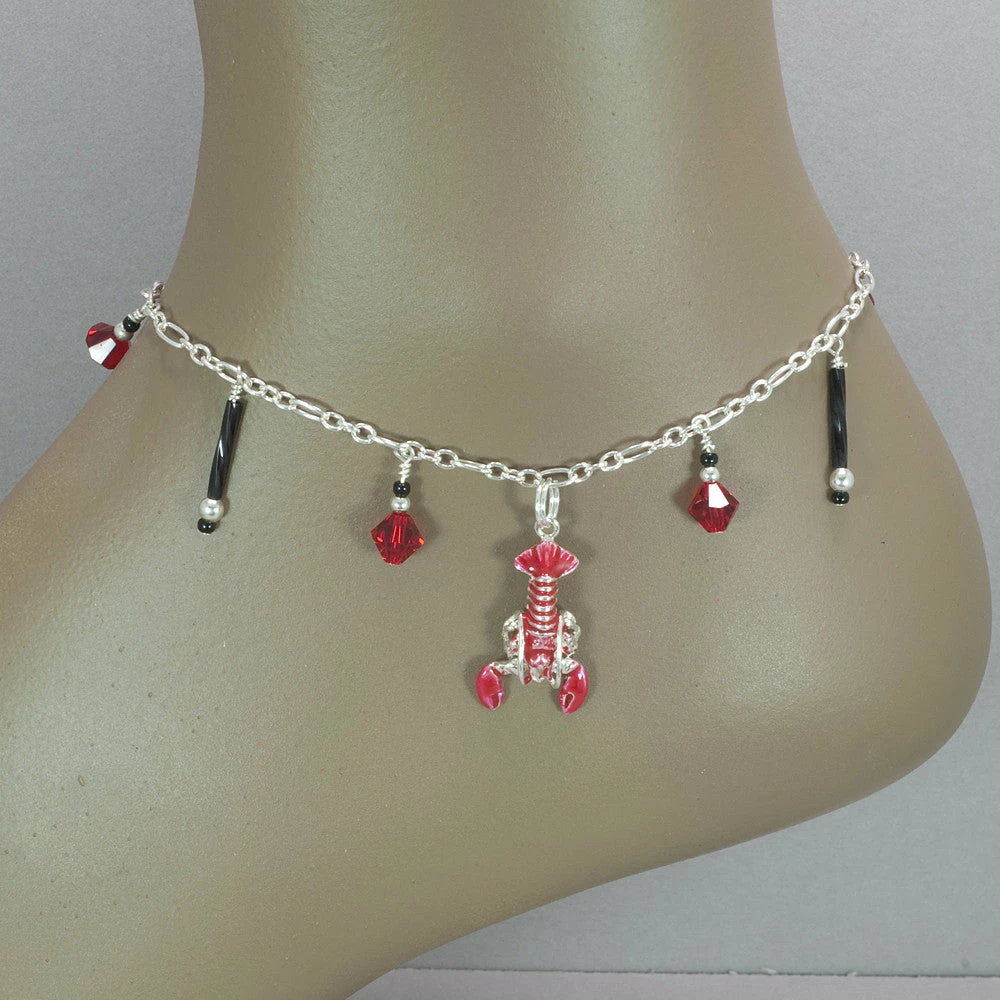 One of a kind anklet with a sterling silver and enamel lobster charm, with articulated claws (so cute), accented with red and black crystal beads all on a sterling silver chain. Lobster clasp. Adjustable length measuring 10 3/4″ at the longest.