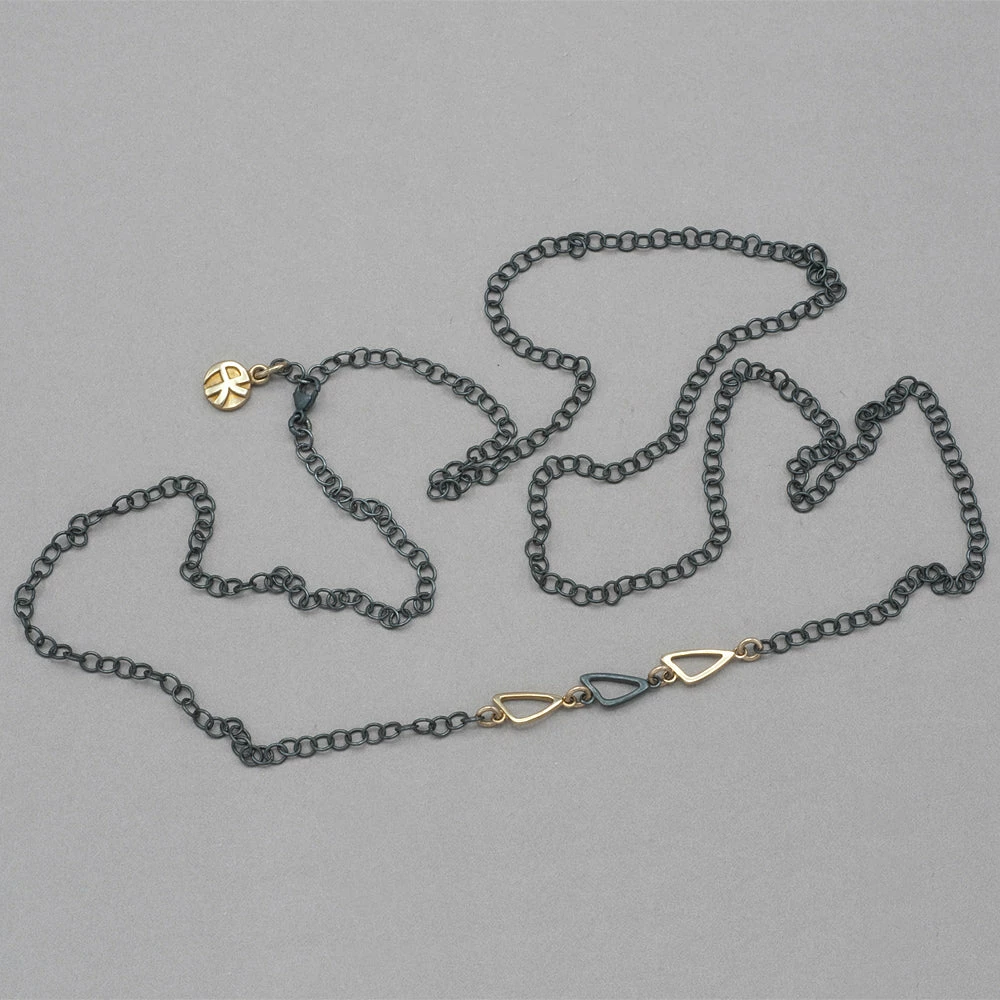 Oxidized sterling silver chain with 22K gold and oxidized triangular links. Design meaning: Triangle: The Divine, Immortality, Power, Safety, Success and Prosperity. Adjustable up to 37″ long.