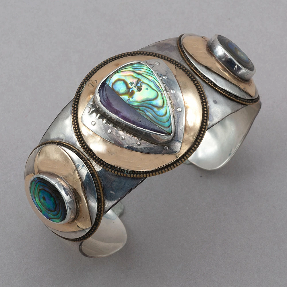 14-karat gold fill, bronze and sterling silver with abalone and amethyst inlay. Measures 2″ across, 1 1/4″ wide, with a 1″ opening. rbj cf16s