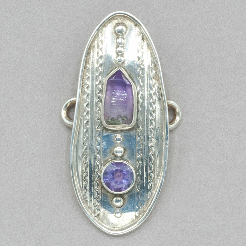 Embossed sterling silver charm with a faceted amethyst and an amethyst crystal. Tabra charms are used to fasten Tabra connector chain. Measures 1 3/4″ long, 7/8″ hook width. ti 97c5t