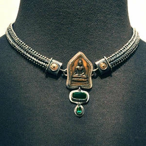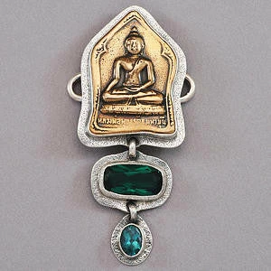 Seated Buddha in bronze above a rectangle of green quartz. Set in textured sterling silver. Tabra charms are used to fasten Tabra connector chain. Measures 2 3/8″ L x 1″ W. Shown here with 3 different styles of necklace connector chain. Chain is sold separately. ti ch502