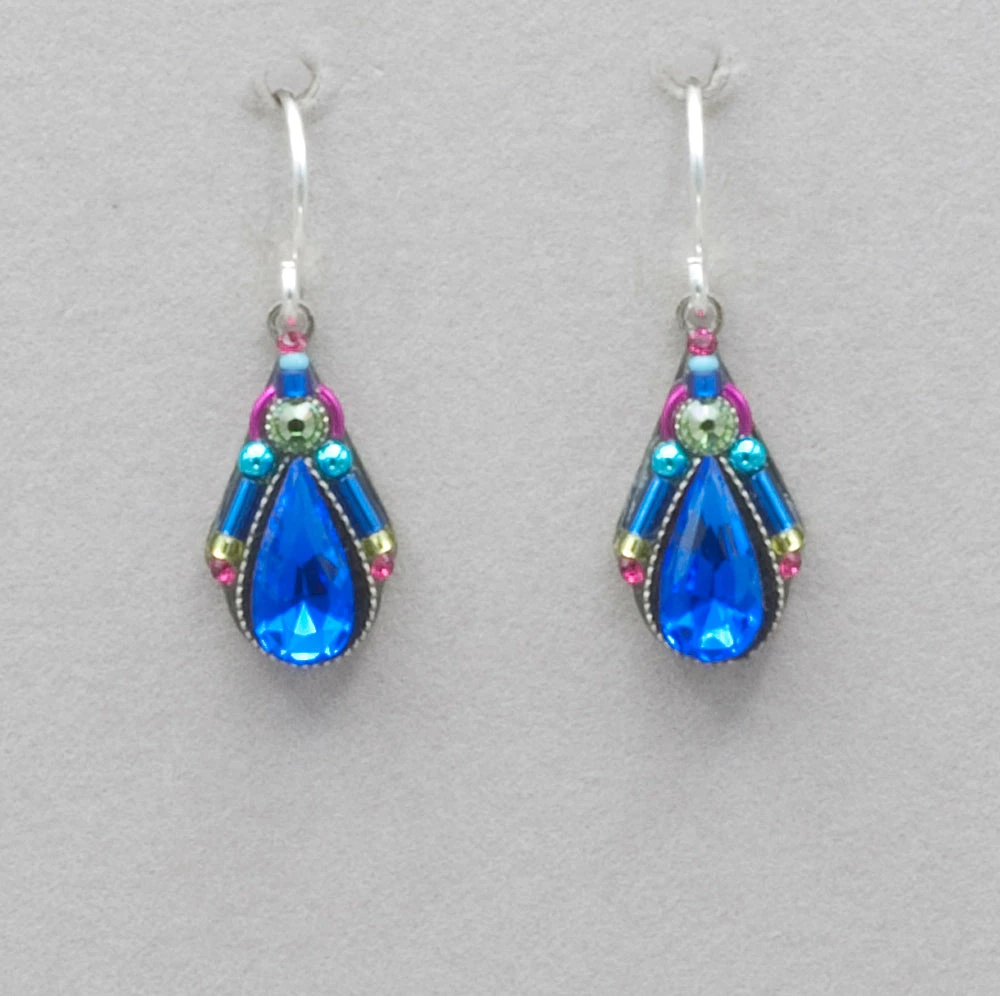 Made in Guatemala, these intricately embellished mosaic earrings are comprised of Swarovski crystals and various other materials. Sterling silver wires. Measures 1 1/8″ long by 3/8″ wide. ff 7850