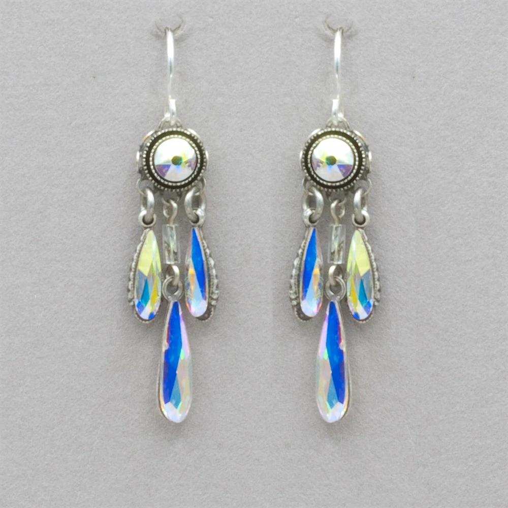 Made in Guatemala, these intricately embellished mosaic earrings are comprised of Swarovski crystals and various other materials. Sterling silver wires. Measures 1 3/4″ long by 3/8″ wide. ff 7779