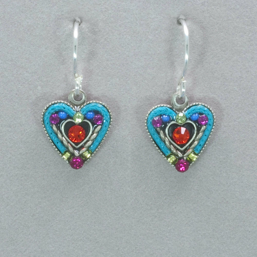 Made in Guatemala, these intricately embellished mosaic earrings are comprised of Swarovski crystals and various other materials. Sterling silver ear wires. 7/8 ” L x 3/8″ W. ff 7717