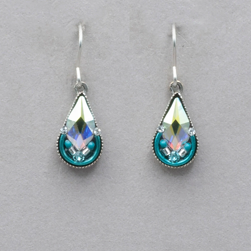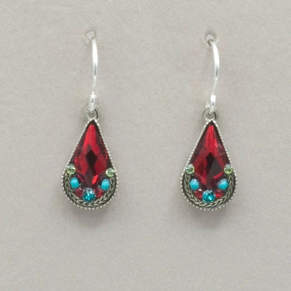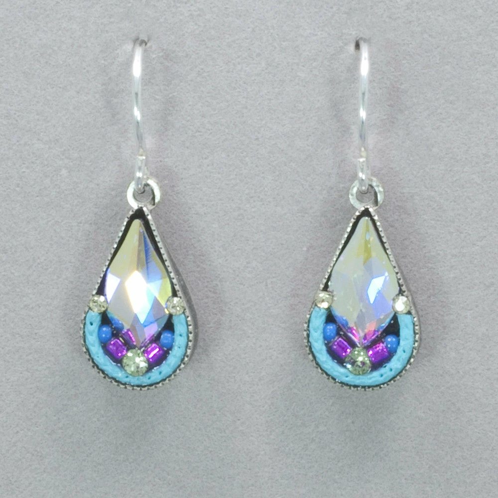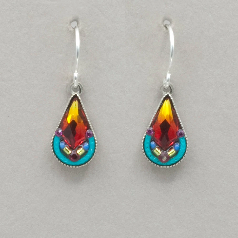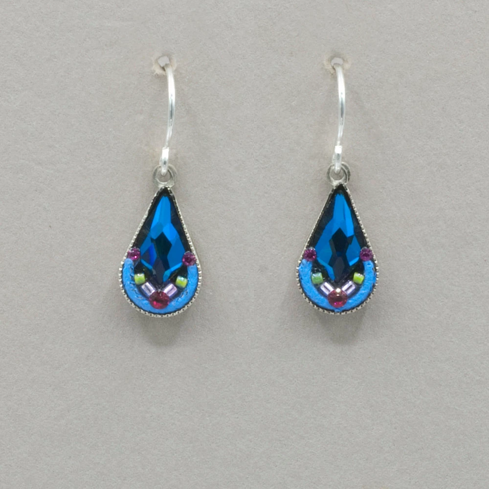 Made in Guatemala, these intricately embellished mosaic earrings are comprised of Swarovski crystals and various other materials. Sterling silver ear wires. 1 ” L x 3/8″ W. ff 7733