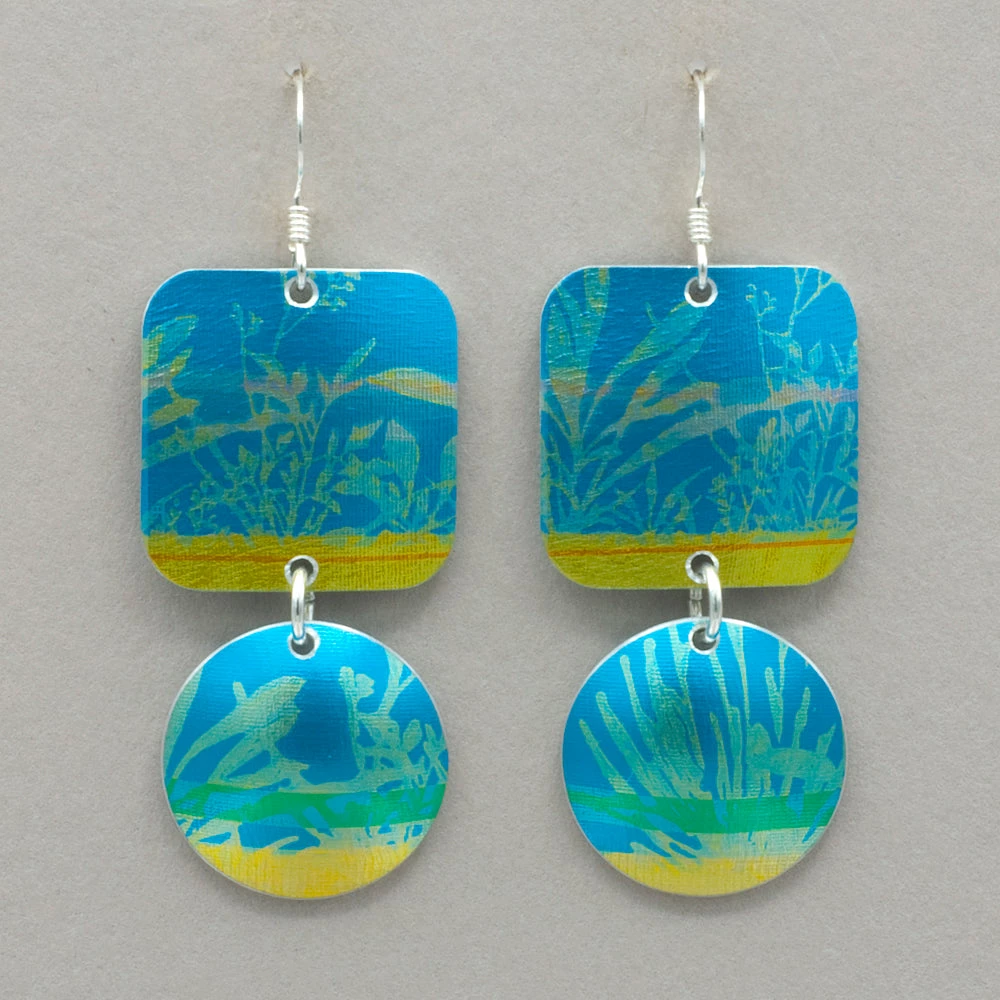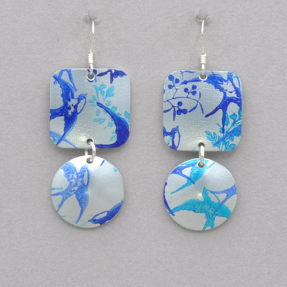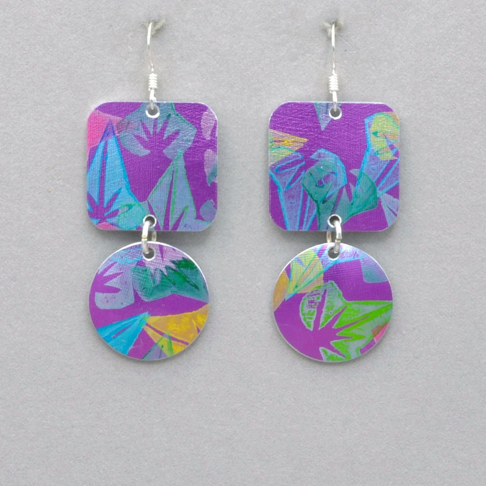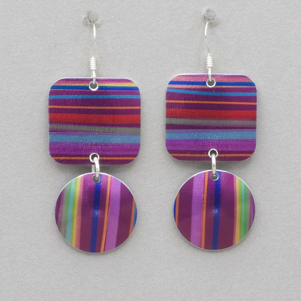 Lightweight anodized aluminum with sterling silver ear wires. Measures 2″ long by 3/4″ wide. ha 0051