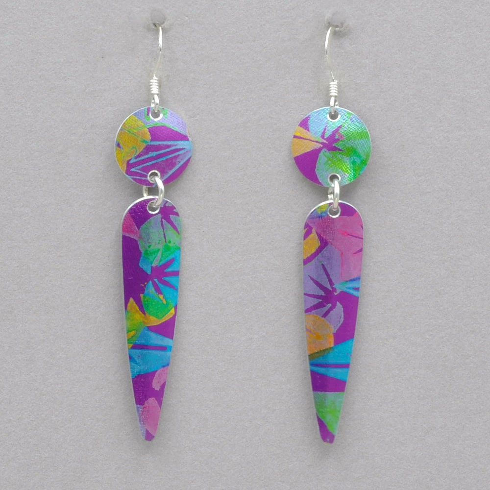 Lightweight anodized aluminum with sterling silver ear wires. Measures 2 5/8″ long by 1/2″ wide. ha 0047