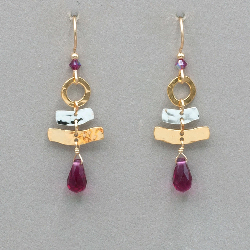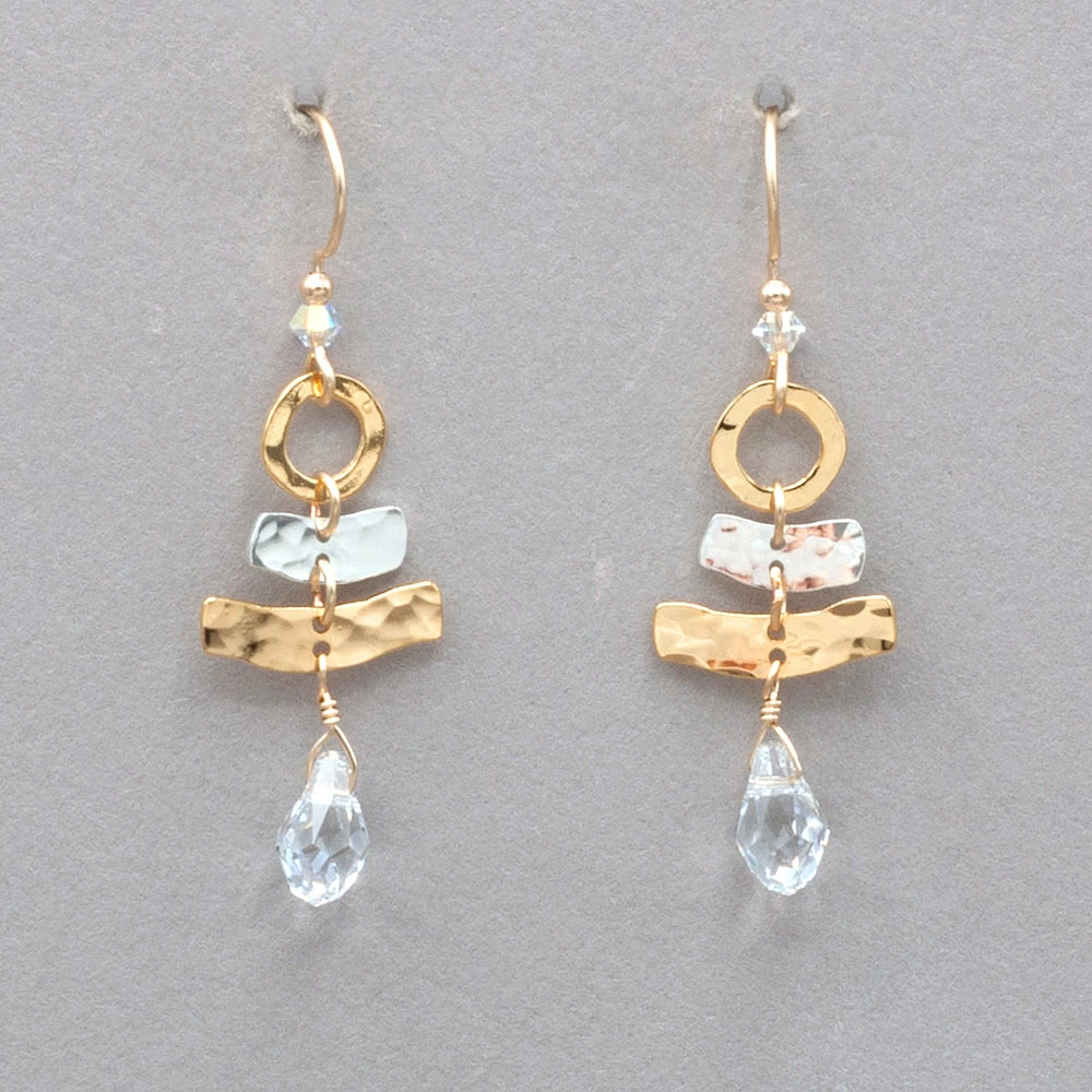Our Ciel Sparkle Earrings feature a stacked pyramid of geometric shapes in a twirling display of hand-hammered gold and silver. Bookended by the eye-catching facets of colorful crystals, this is a style perfect for those days when you just need a little POP! Gold and silver overlay with crystal glass and Swarovski crystal on sterling silver ear wires. Measures 1 3/4″ long by 5/8″ wide.