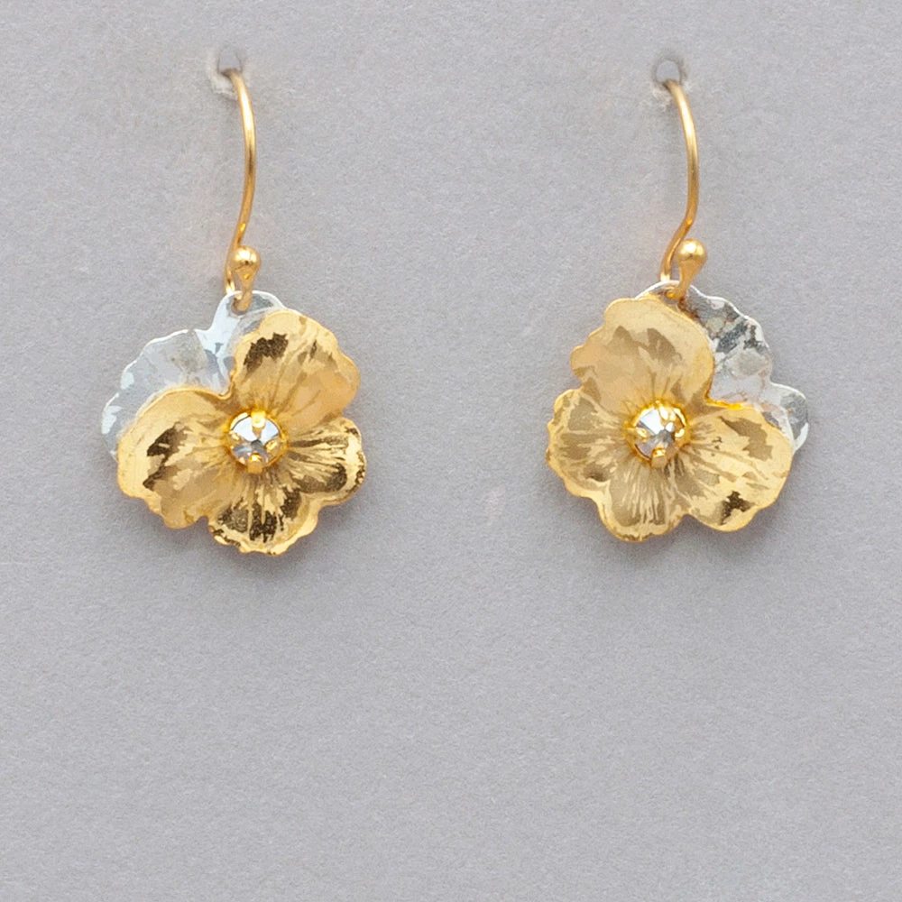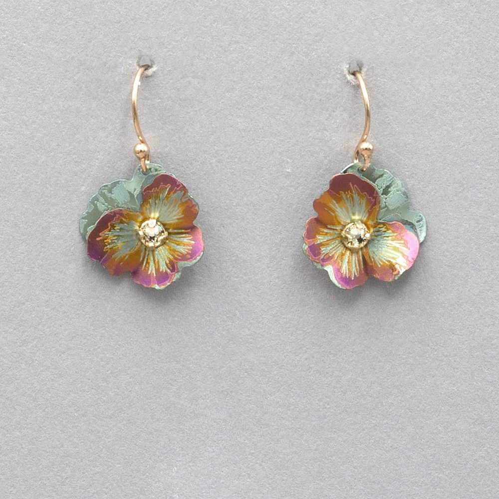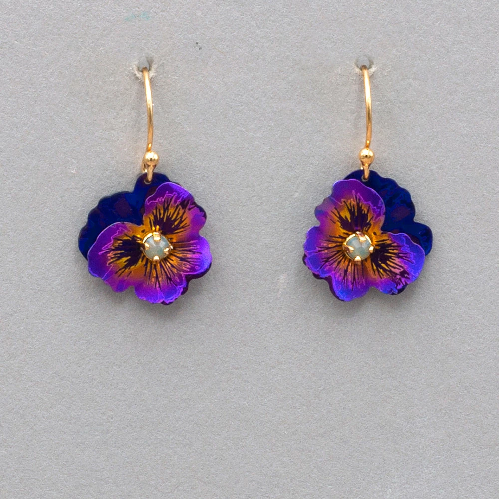 A fantastic display of an iconic springtime bloom, our Garden Pansy Drop Earrings are a must-have for the Holly Yashi collector, or anyone who wants to freshen up their look! Striking for their small size, these cheerful varietals feature life-like overlapping ruffled petals in a brilliant range of candy store hues. Gold overlay and silver overlay, or niobium, with Swarovski crystal on gold overlay or sterling silver ear wires. Measures 1 1/8″ long by 5/8″ wide.