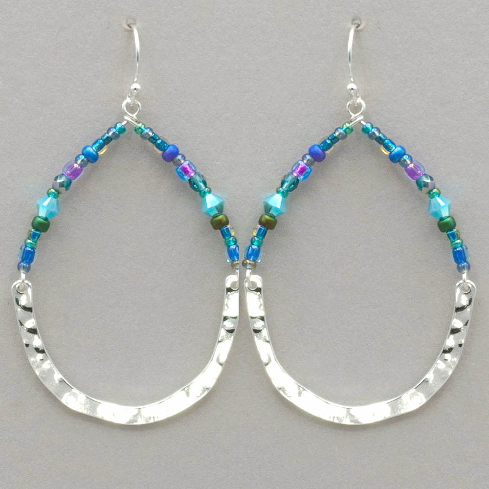 This combination of beads and metal makes a fun and flexible earring. Bohemian glass, Swarovski crystal, and gold overlay or silver overlay. Gold overlay or sterling silver ear wires. Measures 2 3/4″ L x 1 1/2″ W.