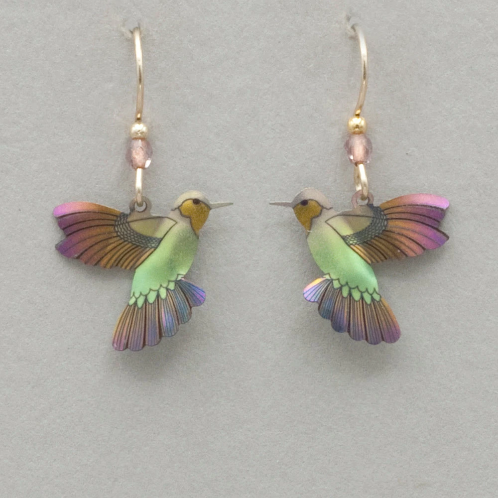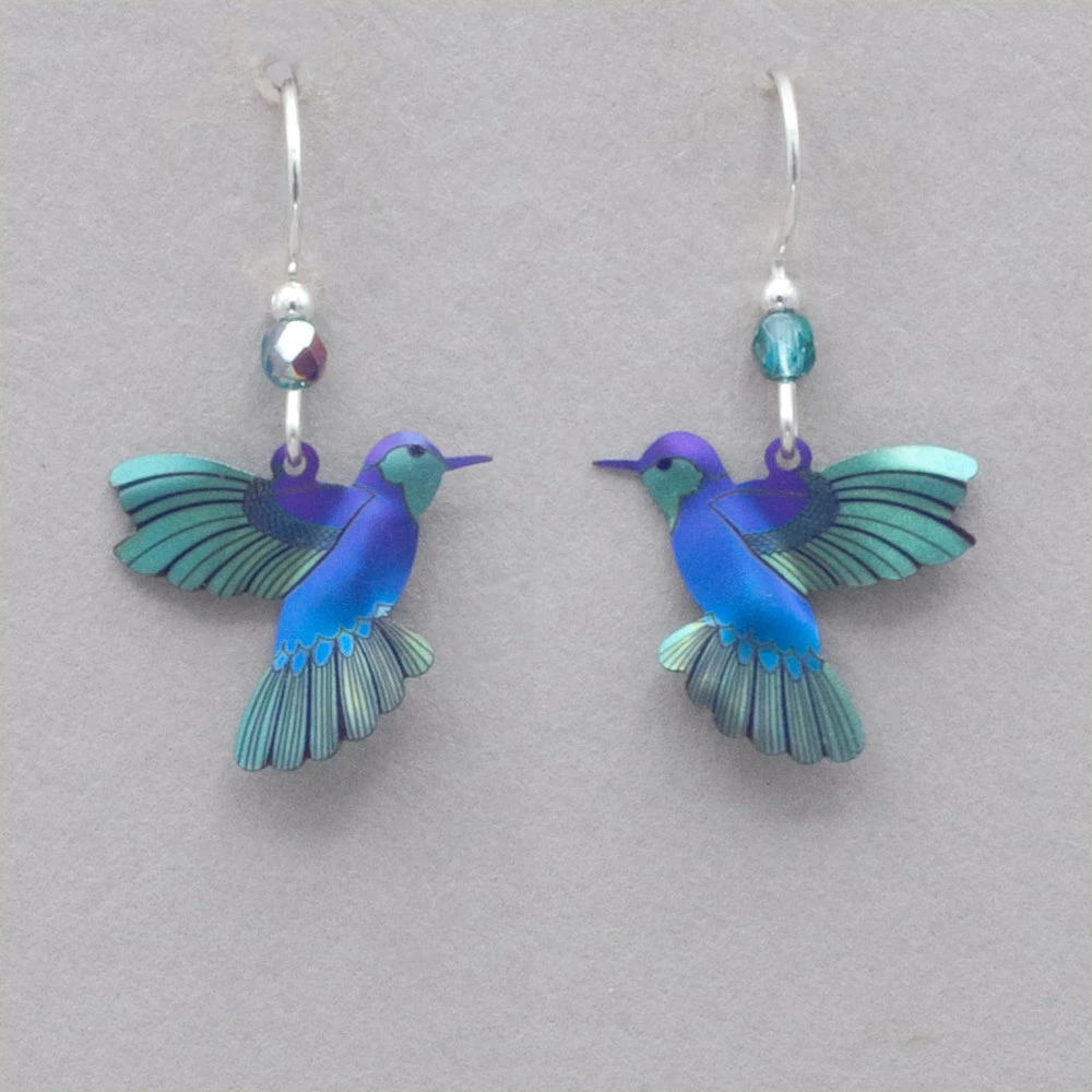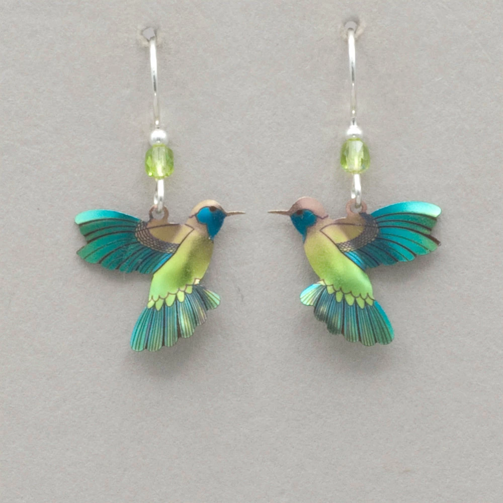 Sweet, vibrant, joyful. Our Picaflor Earrings embrace the essence of this magical creature. Dainty hummingbirds artfully detailed and hand-colored with exhilarating hues flit about from delicate ear wire. The perfect peek-a-boo style to dress up any look. Niobium on sterling silver or gold filled ear wires. Measures 1 1/4″ long by 3/4″ wide.