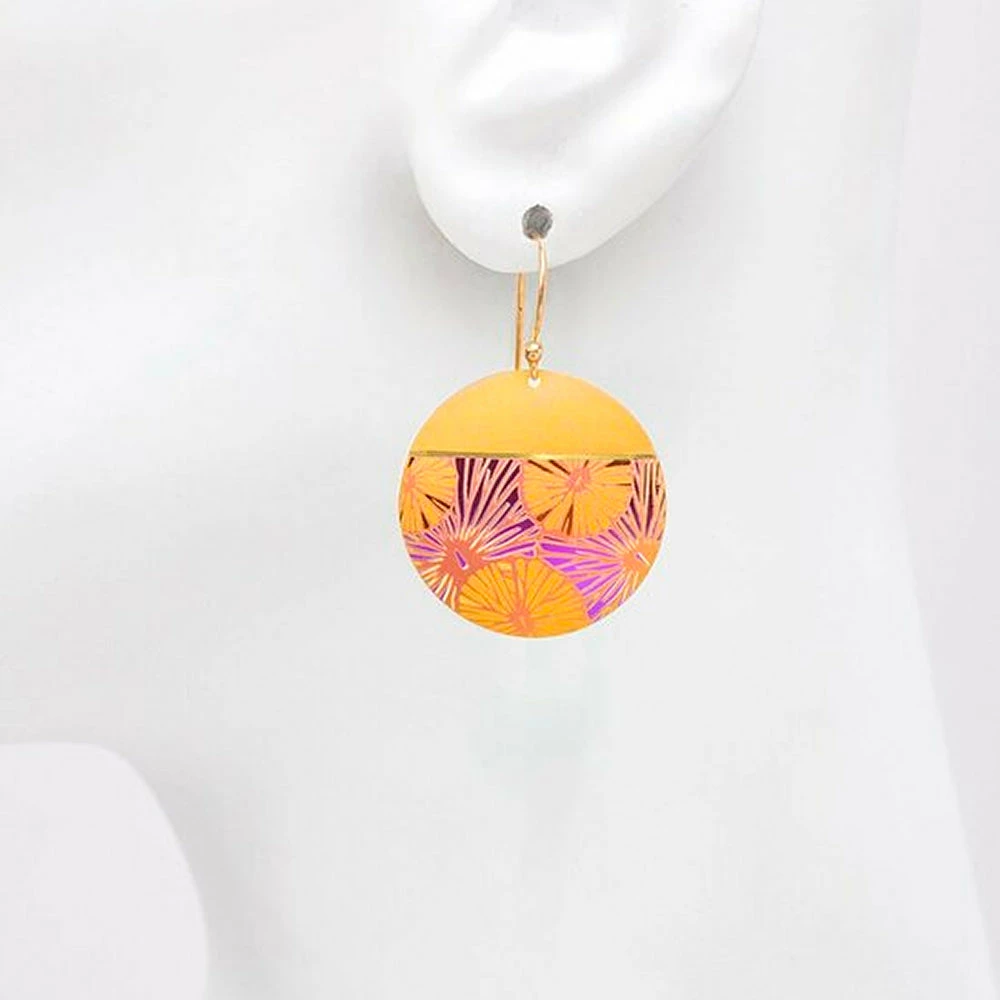 These earrings give you a graphic motif with a mid-century modern nod that is unapologetically vibrant and optimistic. Paired with our edgy play on contrasting texture and sheen on a simple, circular silhouette, these are a little modern, a little retro, and a lot of fun! Niobium on gold overlay ear wires. Measures 1 1/2″ long by 7/8″ wide.