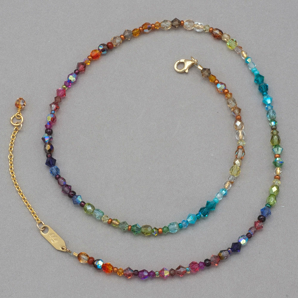 The full spectrum of polychromatic sparkle cascades in a glittering rainbow of European crystal and Bohemian glass in our Reverie Necklace. An elegant way to add vibrant color to your look. Swarovski crystal and bohemian glass with a gold overlay clasp. Measures 16-18″ long.