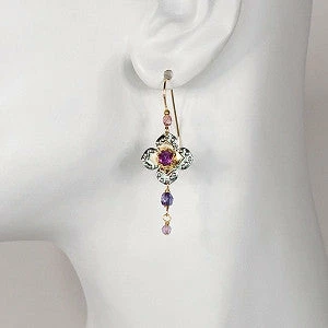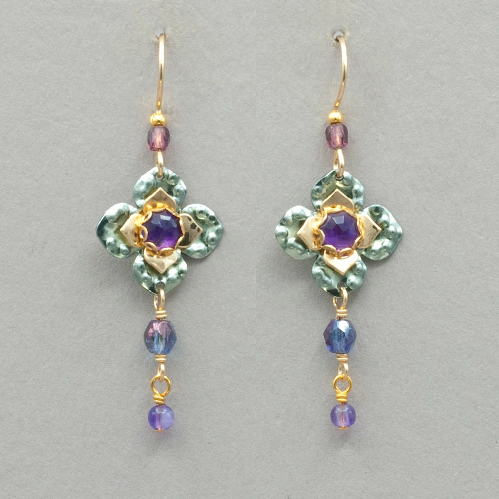 These earrings are stately enough for any occasion. Their romantic floral design make these earrings a great gift for someone special. Amethyst, niobium, gold filled, and Bohemian glass. Gold filled ear wires. Measures 1 7/8″ L. x 5/8″ W.