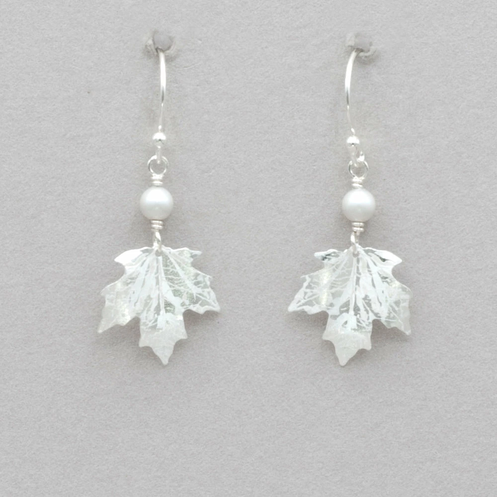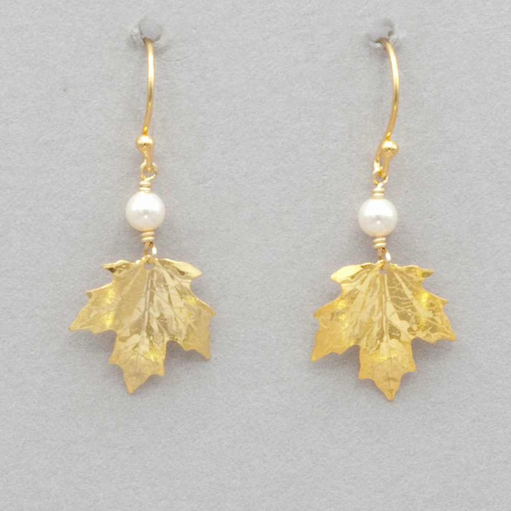 A fresh take on a favorite motif, this dainty design features delicate coloring, detailed patterns and cutwork, and a subtly hand-hammered finish. Our Sugar Maple Earrings are perfect for nature lovers and to wear as a symbol of strength, beauty and inner sweetness. Niobium, gold overlay, or silver overlay with bohemian glass or Swarovski crystal pearls on gold overlay or silver overlay ear wires. MeasuresÂ