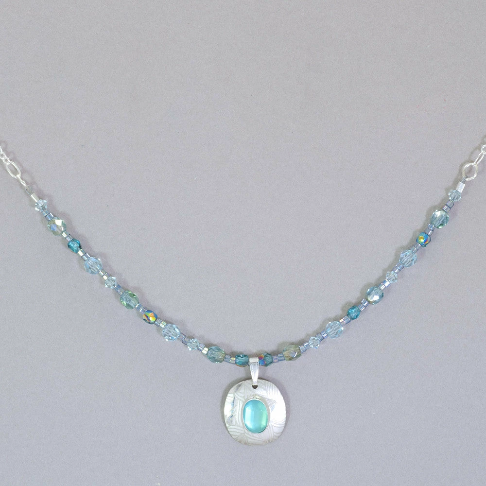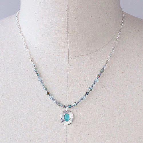 This beaded necklace hosts a brilliant pendant with a gleaming center gemstone, surrounded by delicate beads for a feminine and radiant effect. faceted glass or amethyst, sterling silver or gold filled, Swarovski crystal, and Bohemian glass. Silver overlay or gold overlay chain. Adjustable, 18″ – 20″ long. Pendant drop measures 3/4″ long by 1/2″ wide.