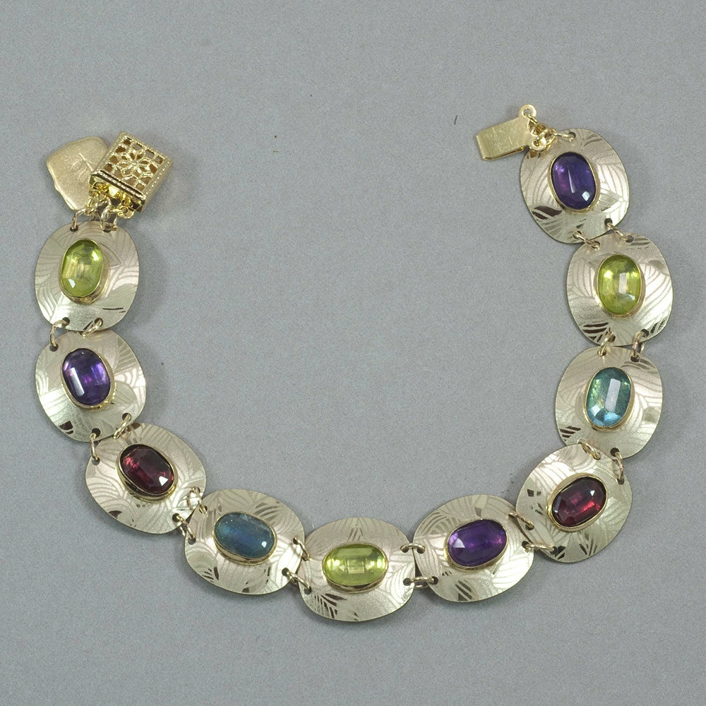 Featuring an art-deco inspired motif, this lightweight and ultra-wearable bracelet features hand-set gemstones for an absolutely radiant effect. Peridot, garnet, or faceted glass, set in gold fill or sterling silver. Measures 7 1/2″ long.