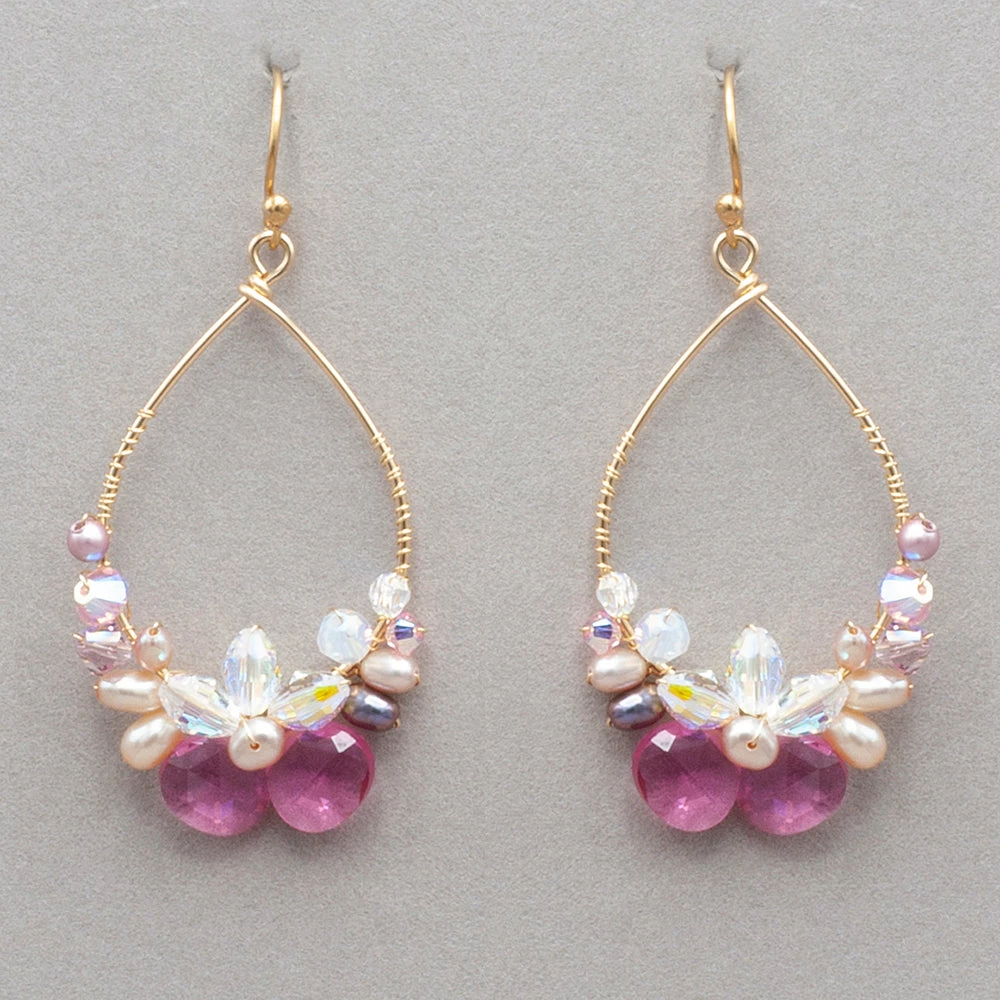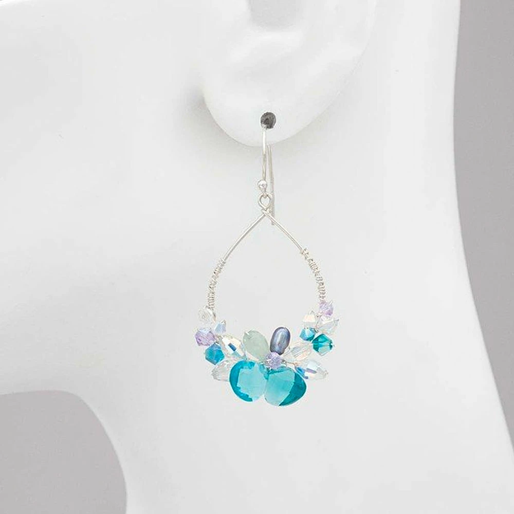 Your ticket to paradise: glistening beads, freshwater pearls, and sun-kissed crystals. Each pair of our Tropical Punch Earrings is delicately handcrafted into a playful teardrop for laid-back luxury vibes. Crystal glass, Swarovski crystal and freshwater pearls with gold filled or sterling silver wires on gold overlay or sterling silver ear wires. Measures 2 1/8″ long by 1 1/8″ wide.