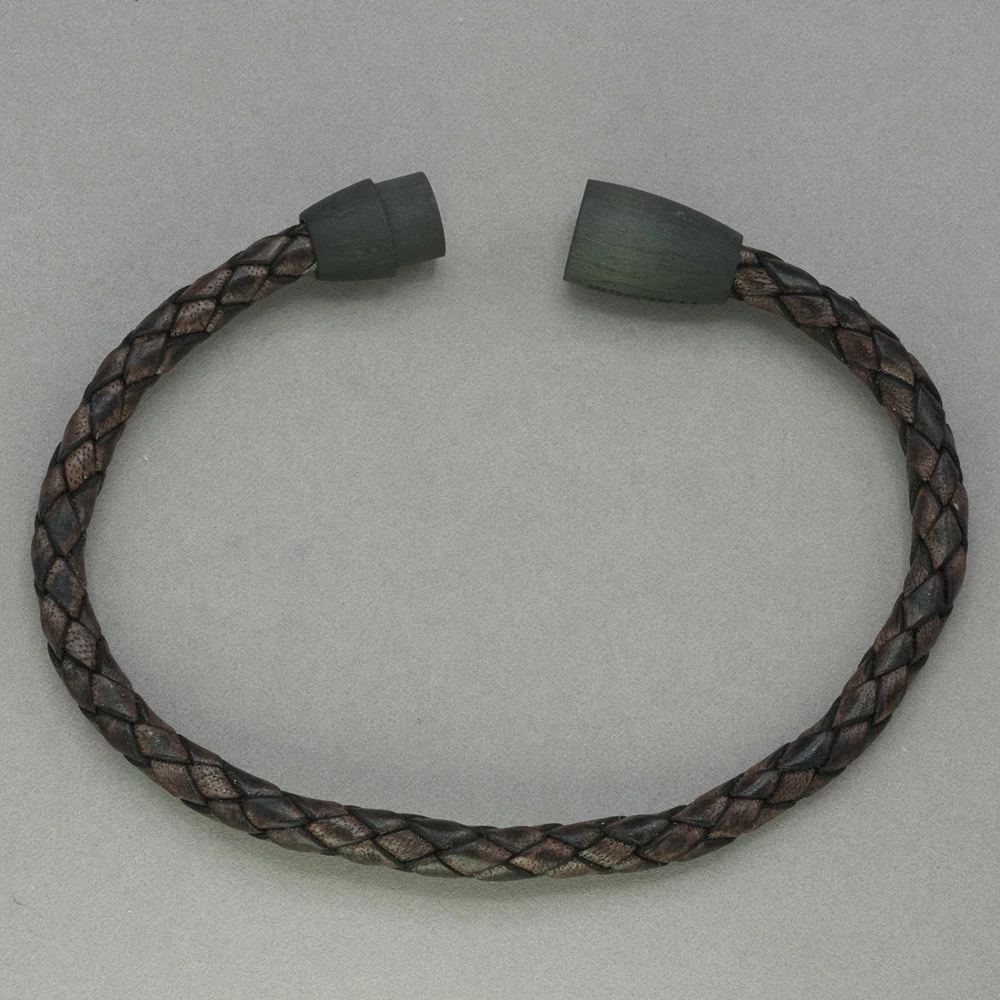 Antiqued brown leather bracelet with carbon fiber and stainless steel clasp. About 8.5″ long. ital slb 287