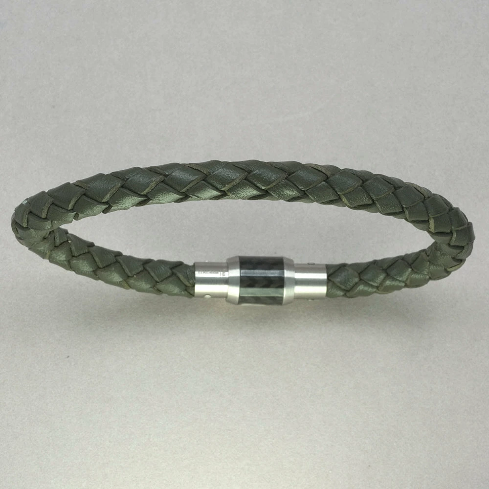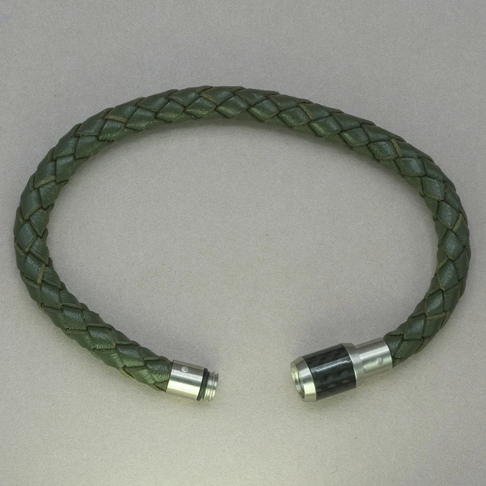 Army green leather bracelet with stainless steel and carbon fiber screw clasp. Measures 8.7″ long. ital slb 228