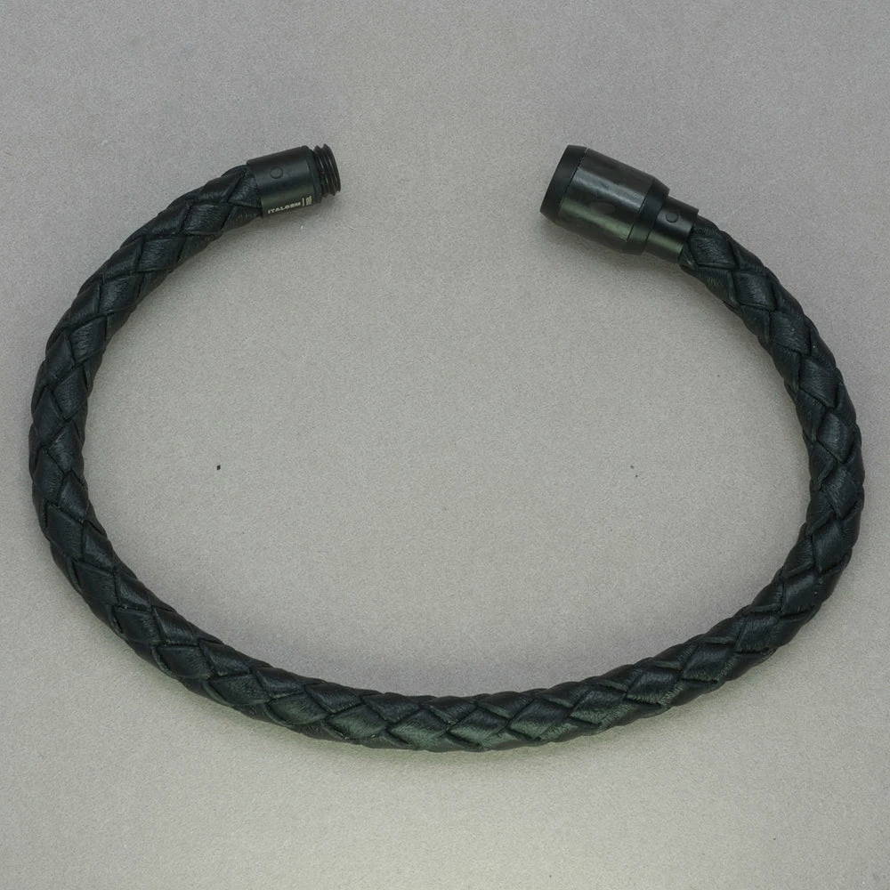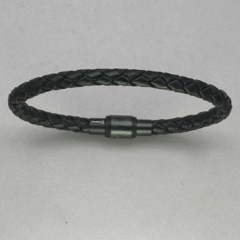 Black leather bracelet with black IP stainless steel and carbon fiber screw clasp. About 8.2″ long. ital slb 264