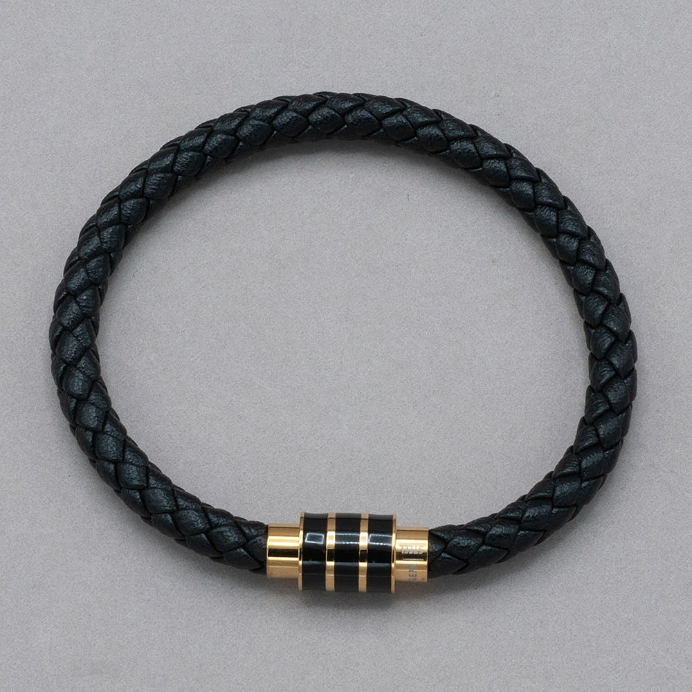 Gold and black ion-plated stainless steel clasp on a black leather bracelet. Measures 8.5″ long. ital slb 531