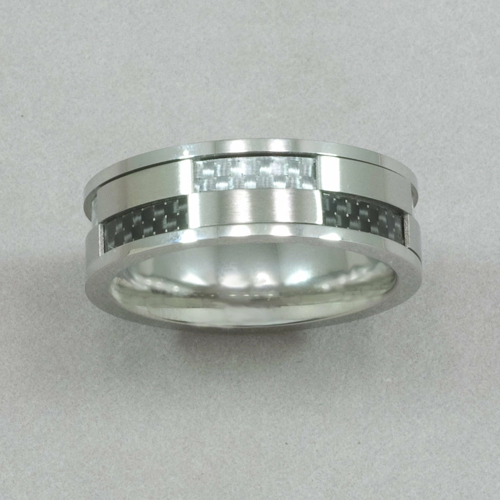 Italgem Steel Italgem Stainless Steel Black And White Carbon-Fiber Ring