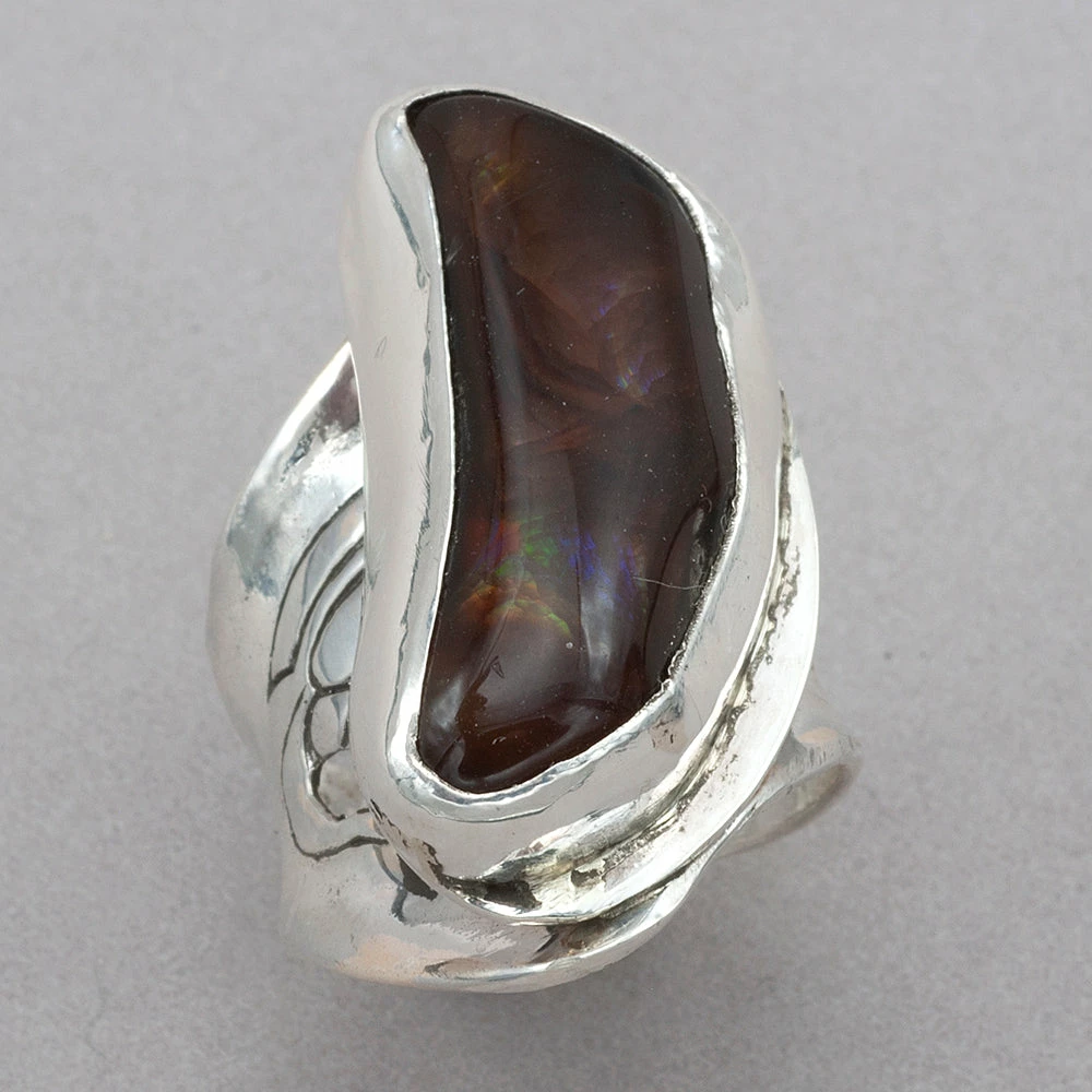 Elongated freeform Mexican fire agate set in sterling silver. A Jim Kelly one of a kind ring. Choose the size you need it to be. Measures: 1 1/4″ L.