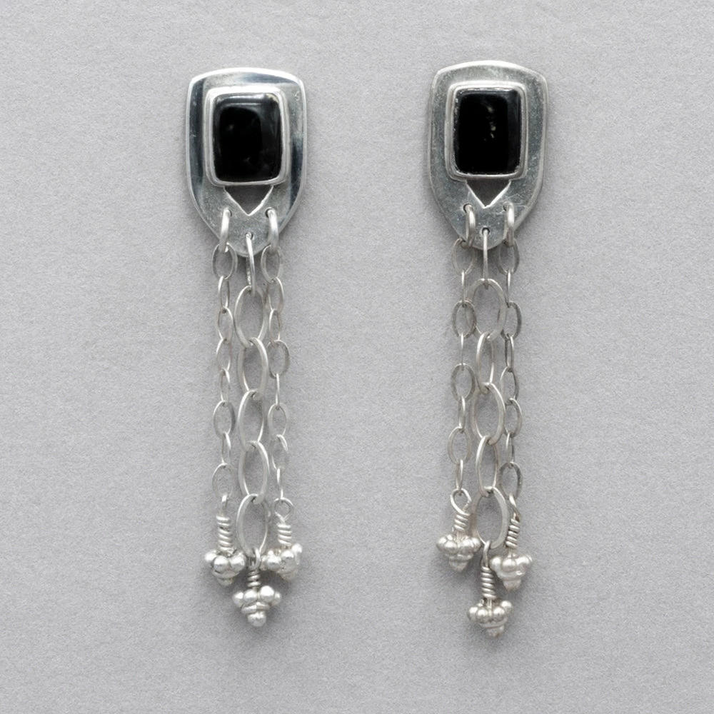 Onyx set in sterling silver with dangle chain accents. Sterling silver posts. Measures 2 1/4″long by 1/2″ wide. jk er104