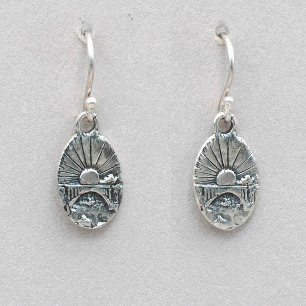 Smaller version of the bas-relief carving of the Rainbow Bridge pendant, these earrings are cast in sterling silver with sterling silver ear wires. Measures 1 1/8″ L x 3/8″ W.