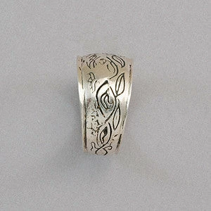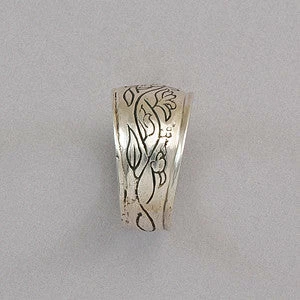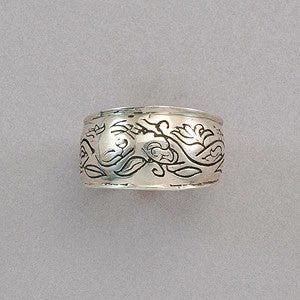 Sterling silver with a floral pattern. Since this ring is handmade, the pattern varies slightly from ring to ring. jk rg36