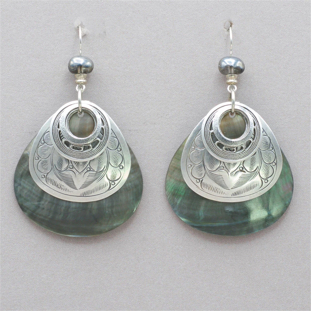 Silver or gold toned metal with an anti-tarnish coating, with mother of pearl and glass bead accents. Hypo-allergenic surgical steel ear wires. Measures 2 5/8″ L x 1 5/8″ W. jmr 2274
