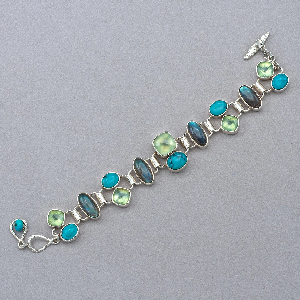 Bracelet of turquoise, labradorite, and faceted prehnite. Measures 8″ long by 3/4″ wide. mm b2093tqlb