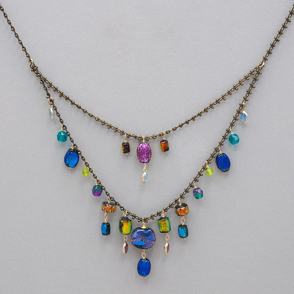 Eclectic and rhythmic, the marriage of offbeat beauty and regal charm in our handcrafted Cabana Necklace will have you feeling like a Bohemian princess. Dichroic glass, Swarovski crystal, European crystal and bohemian glass on an antiqued brass chain. Adjustable 22-24″ length.