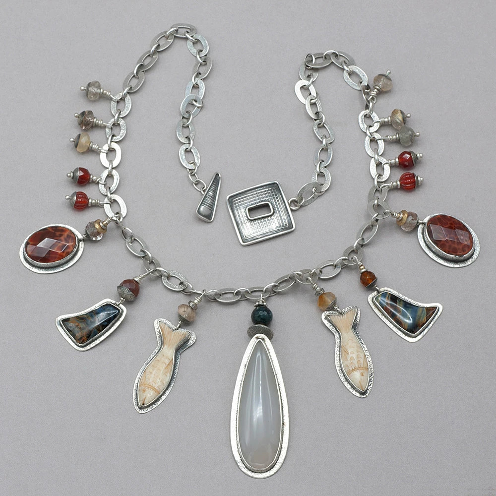 White agate teardrop is surrounded by hand carved bone fish, pietersite and snakeskin agate with beads of carnelian, quartz and faceted dark jade. Sterling silver chain measures 21″ long, and the center pendant piece is 3″ long. ti tn4b