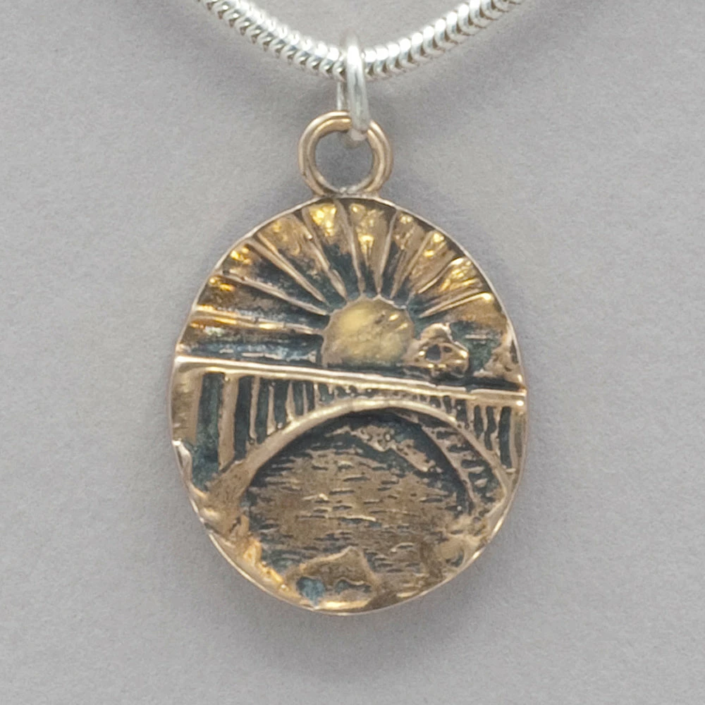 Bas-relief carving of the Rainbow Bridge, cast in bronze. Suitable with our smaller chains. Pendant measures 3/4″ W x 1″ H. Chain shown is not included.