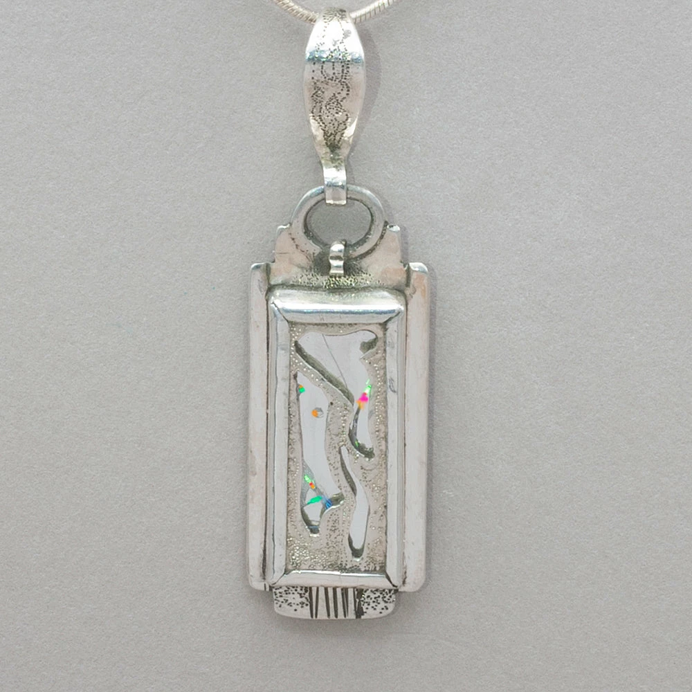 Hand chased sterling silver and etched mirror is set with holographic film to create what we call a “Jim Gem”. These pieces are retablo like objects. jk p384