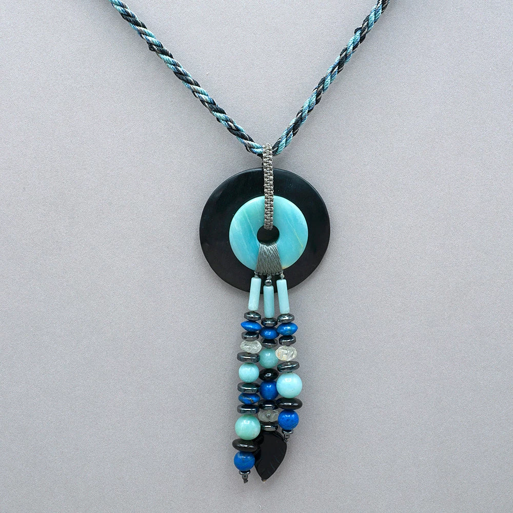 Amazonite and shungite with lapis, onyx. hematite and quartz beads on an adjustable rope necklace. Necklace measures up to 30″+ long. mb n50