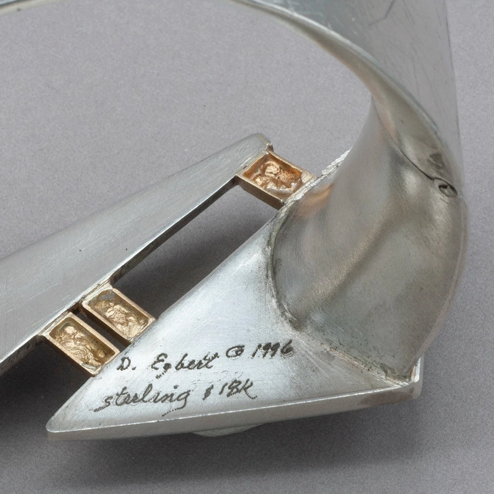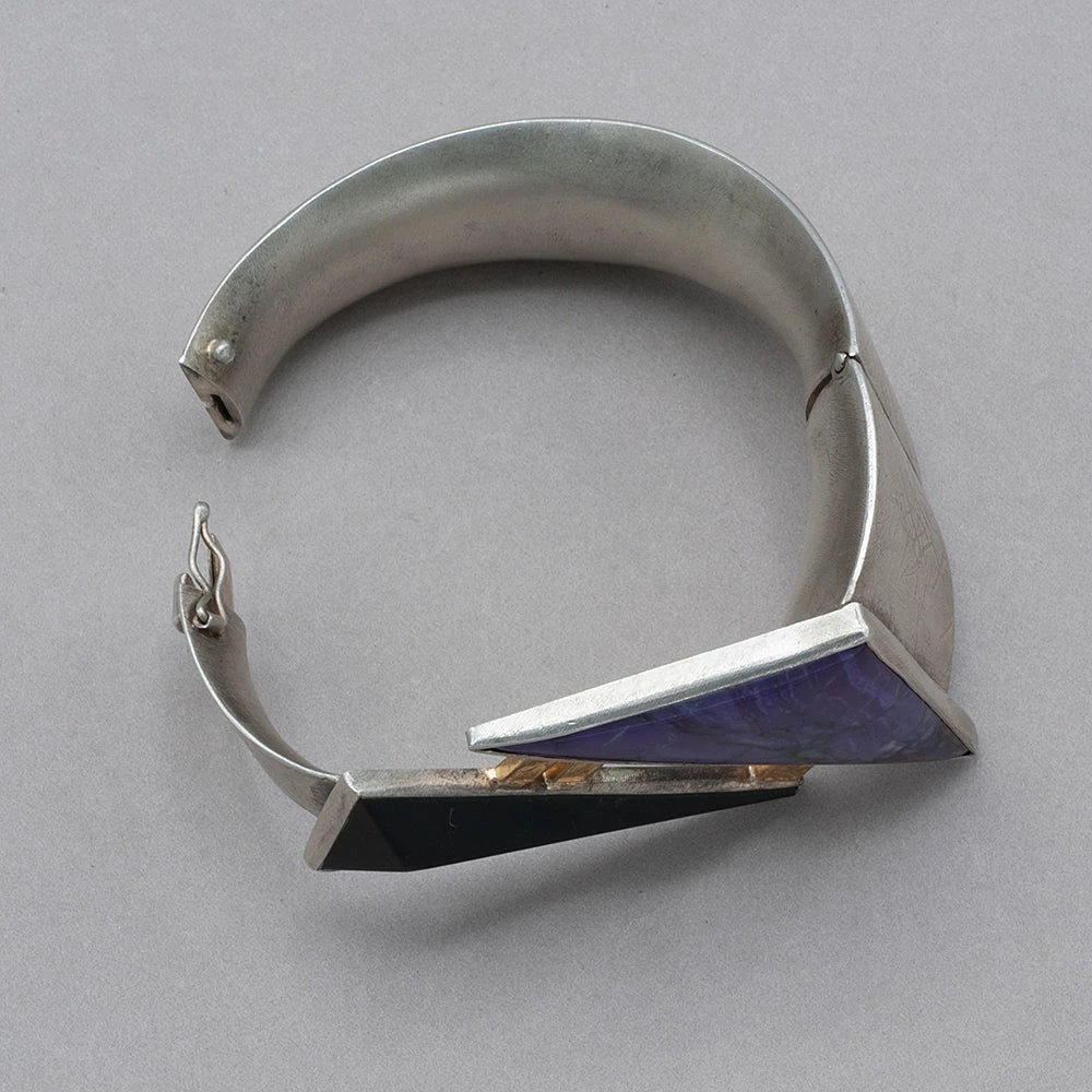 Sugilite and black matte onyx set on hollow curved sterling silver cuff bracelet with 18-karat gold accents. Closed cuff with a hinge and clasp. One of a kind. Estimated retail value $3,200. 1 1/4″ wide, 2 5/8″ across, clasp opens up 1 7/8″. Created by Diane Egbert in 1996. mb b200