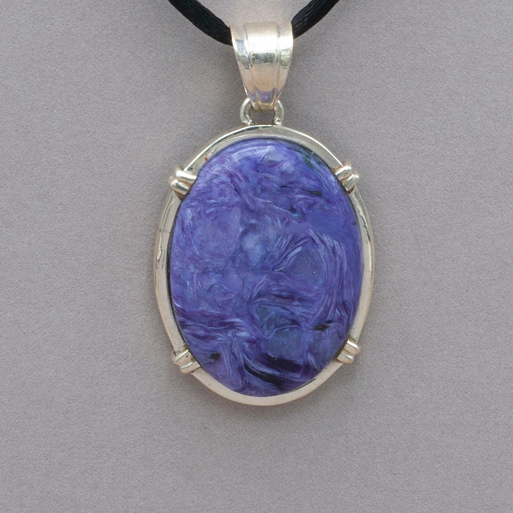 Charoite set in sterling silver. Charoite is found mostly in Russia and Siberia. Pendant measures 2″ long, 1 1/8″ wide. sam charo10