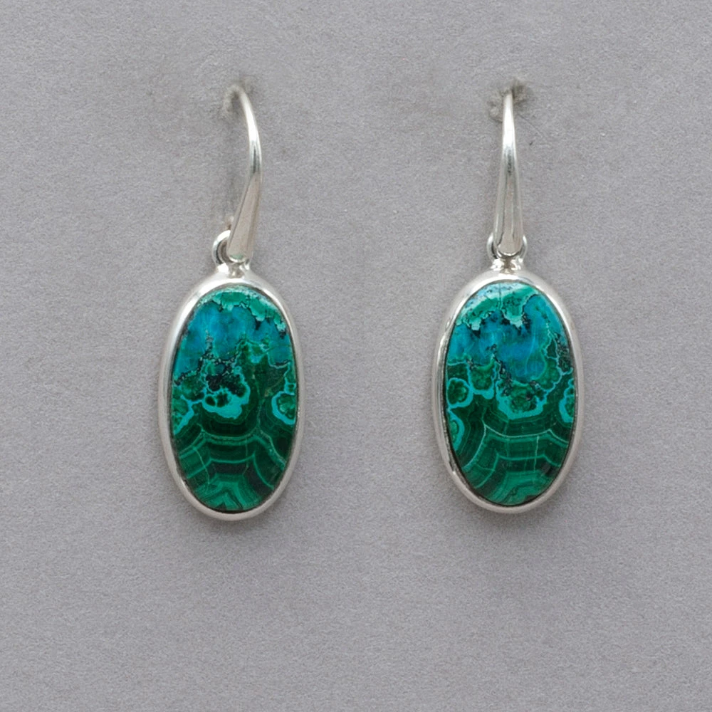 Malachite azurite set in sterling silver. Sterling silver ear wires. Measures 1 1/2″ long by 1/2″ wide. sam azurite