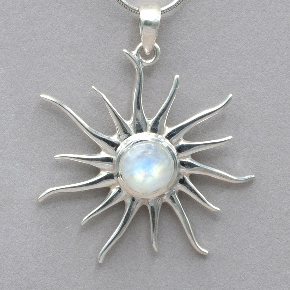 Rainbow moonstone sterling silver sunburst Pendant. Measures: 1 3/4″ diameter by 2″ long. sap 374
