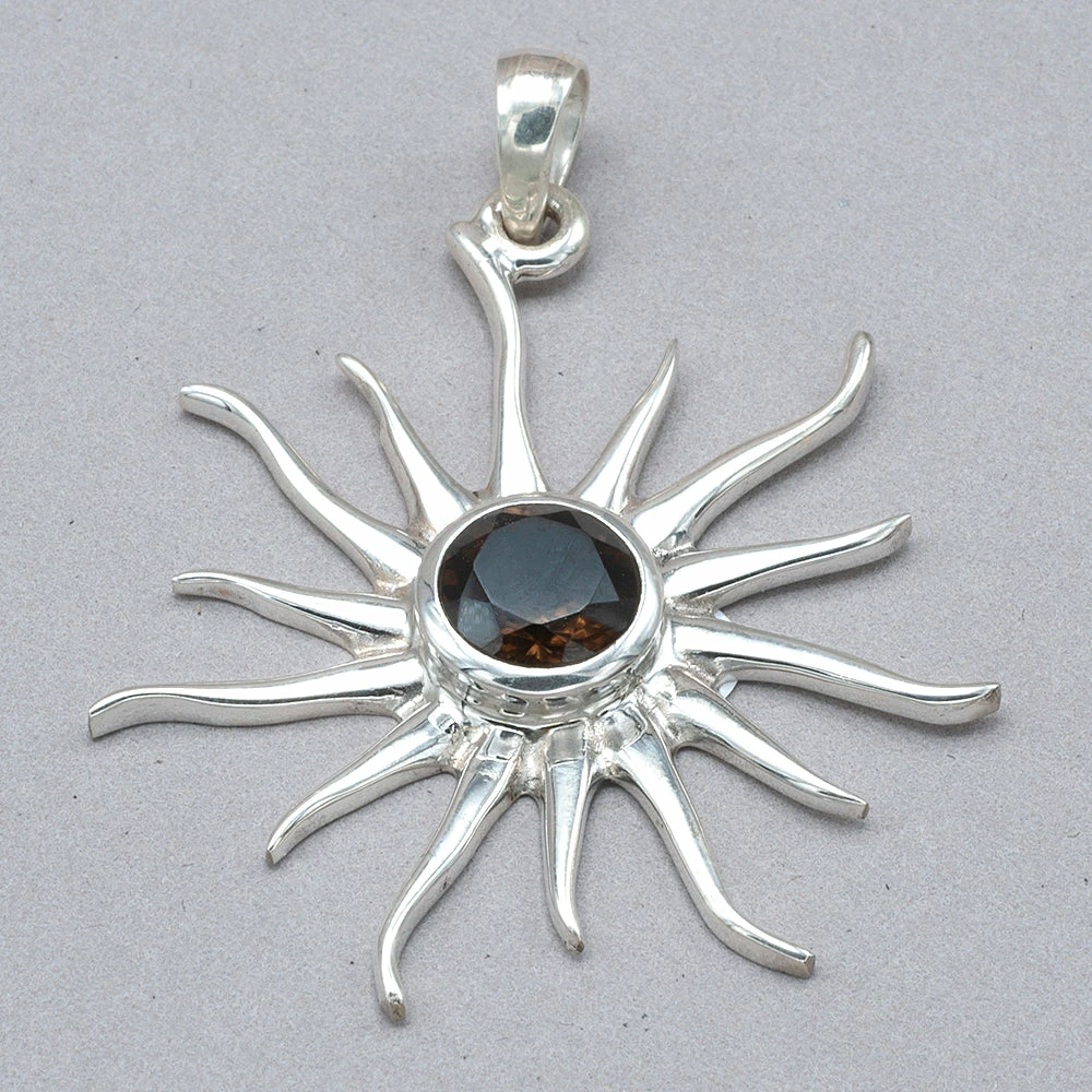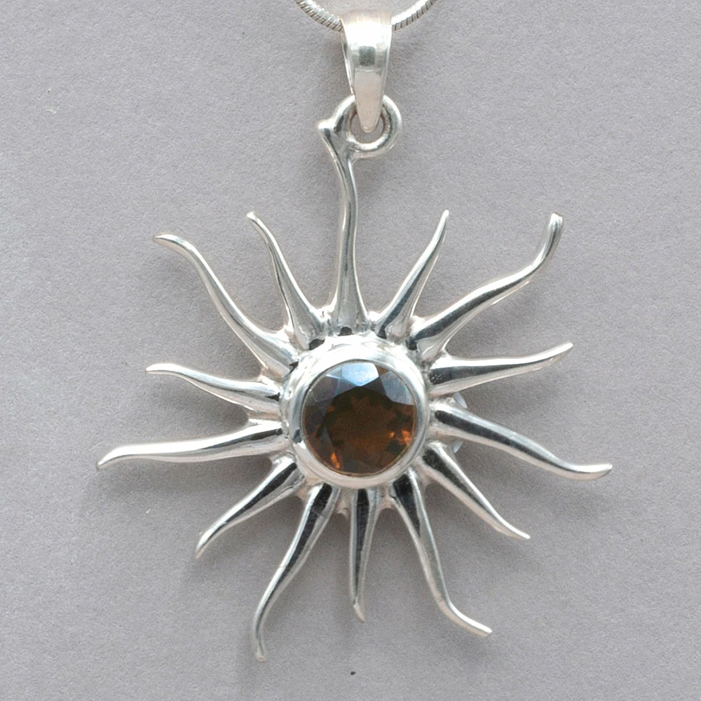 Cinnamon colored quartz set in a sterling silver sunburst pendant. Measures: 1 3/4″ diameter by 2″ long. sap 366