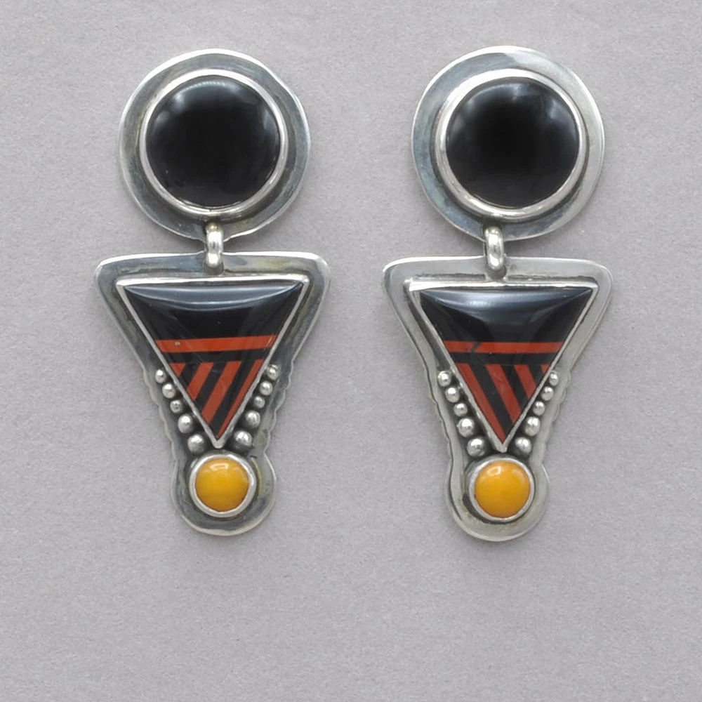 Round black onyx posts with inlay of red jasper and onyx, accented with sterling silver beads and butterscotch amber, set in sterling silver on sterling silver posts. Measures 1 5/8″ long, 3/4″ wide. ti de58