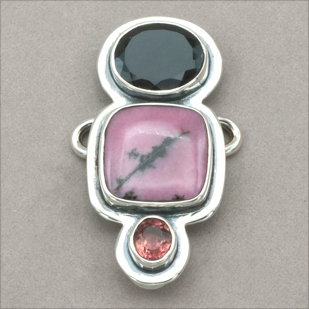 Faceted onyx, rhodonite and pink tourmaline on a sterling silver charm. 1 3/8″ long with a 3/4″ hook length. ti dc65