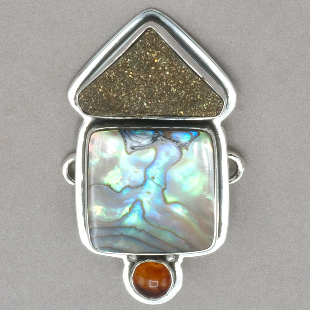 Pyrite, abalone and amber in a sterling silver charm. 1 7/8″ long with a 1″ hook length. ti dc56