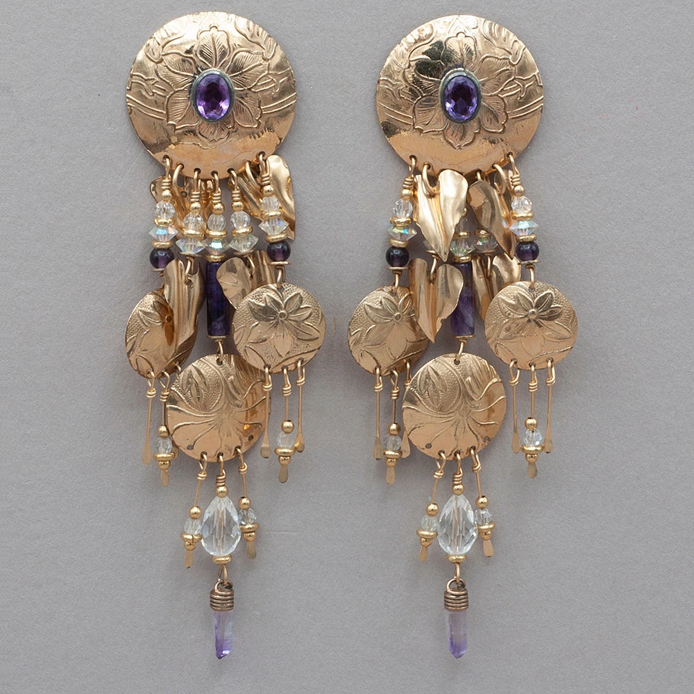 14k embossed gold fill with amethyst and amethyst beads and crystals. Made 1987. 14k gold posts. Measures 4 1/4″ long by 1 1/2″ wide. rbj cr14g