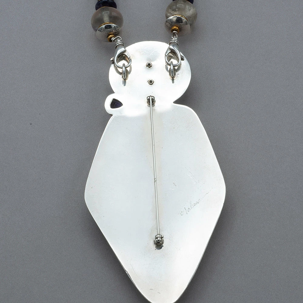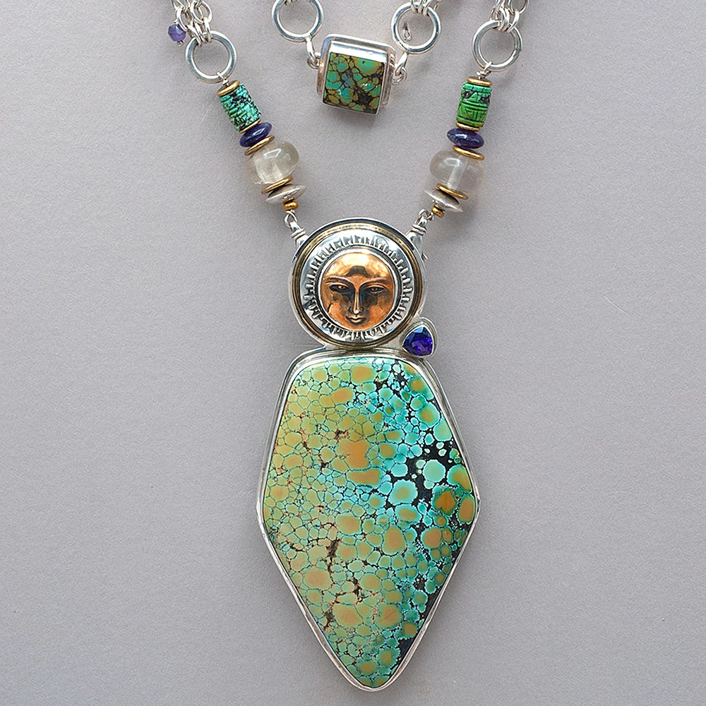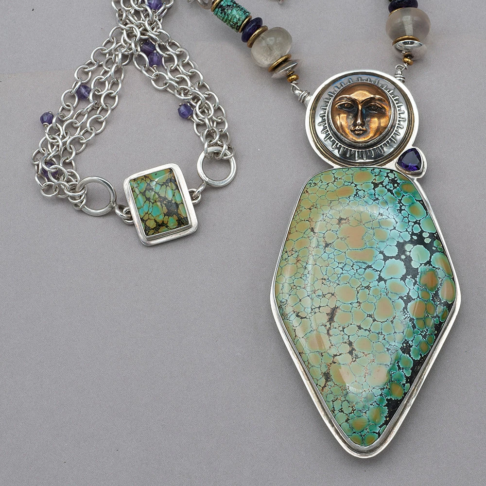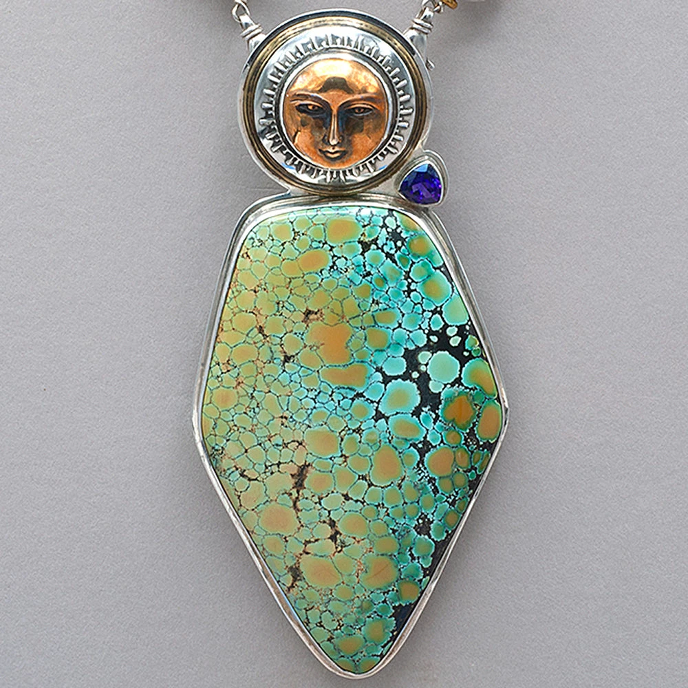 Bronze face set in sterling silver atop a magnificent large Chinese turquoise stone adorned with a trillion cut amethyst. This pin/pendant includes a triple strand sterling silver chain with quartz crystals, amethyst crystals, and carved turquoise beads. Chain attaches to the pendant with sterling lobster claws, and fastens at the neck with a turquoise charm. One of a kind. Pendant measures 5 1/2″ long by 2 1/2″ wide. With chain and charm: 28″ long. Connector charm measures 1″ long by 3/4″ wide. rbj n2000